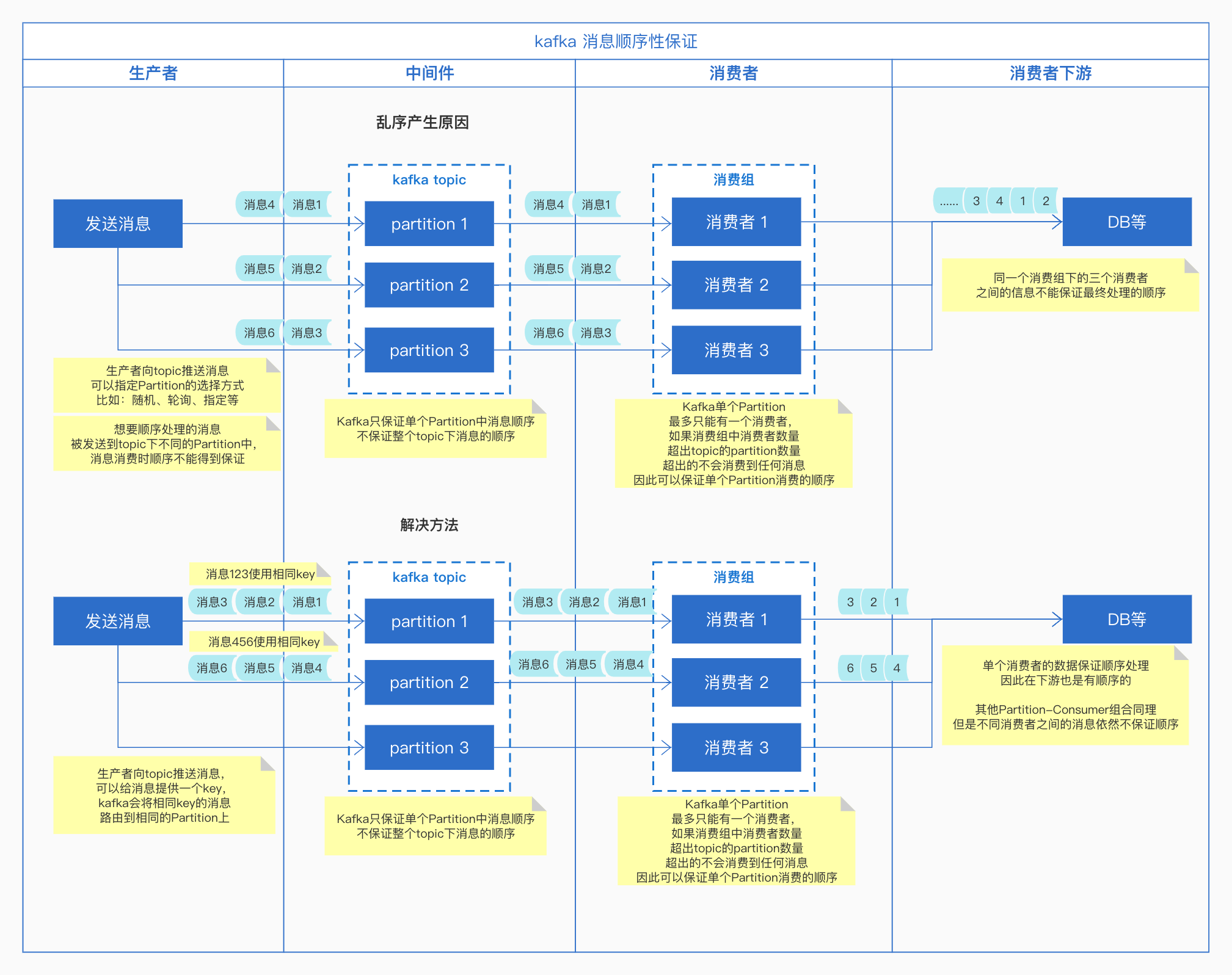 以上的设计理念下,Kafka内部保证在同一个partition中的消息是顺序的,不保证topic下的消息的顺序性。Kafka的消息生产者发送消息的时候,是可以选择将消息发送到哪个partition中的,我们只要将需要顺序处理的消息,发送到topic下相同的partition,即可保证消息消费的顺序性。(多线程语言使用单个消费者,多线程处理数据时,需要自己去保证处理的顺序,这里略过)。
