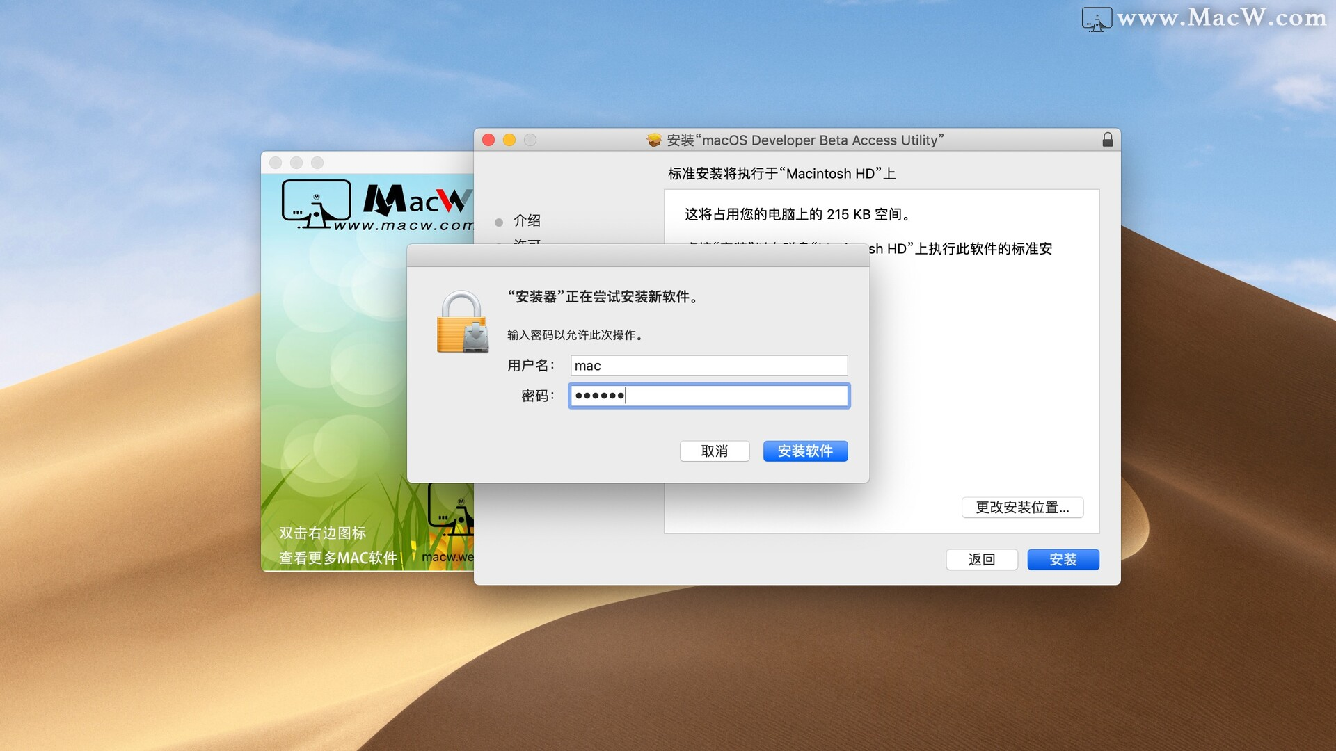 2、安装macOS 11.0公测版升级工具过程中提示需要更改设置,需要输入密码,这里就是输你的开机密码。