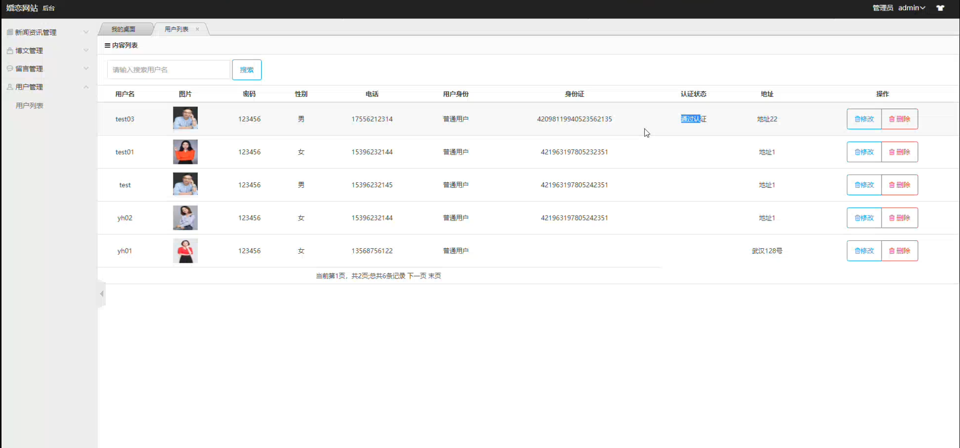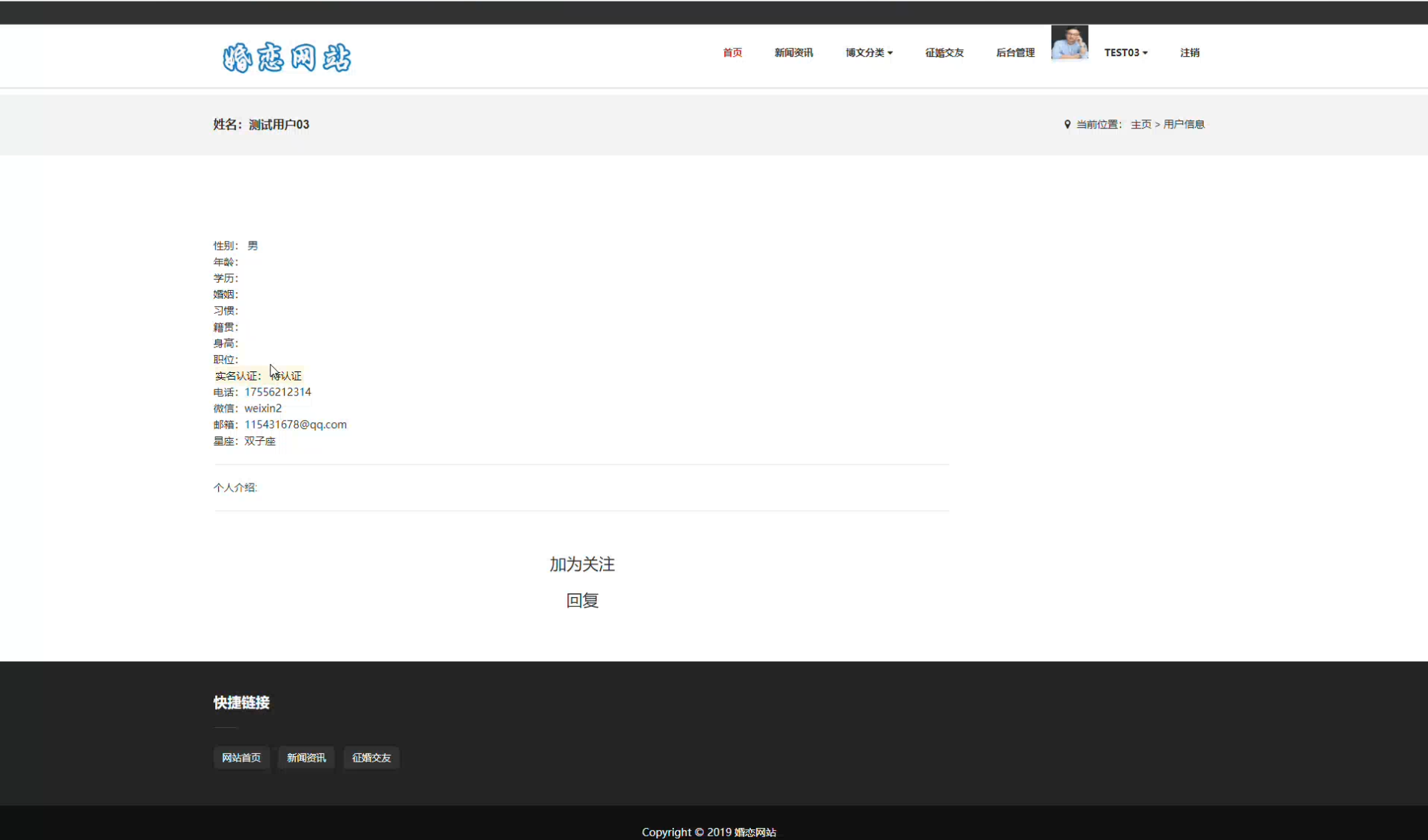 用户信息:用户注册后即开通个人中心,个人中心应具备:站内消息查看、被谁关注、我的关注、我的资料、资料修改、上传照片等功能。其中个人资料的修改于上传照片和认证制度相关,网站预设的管理员会通过这些情况来决定是否通过用户的认证。