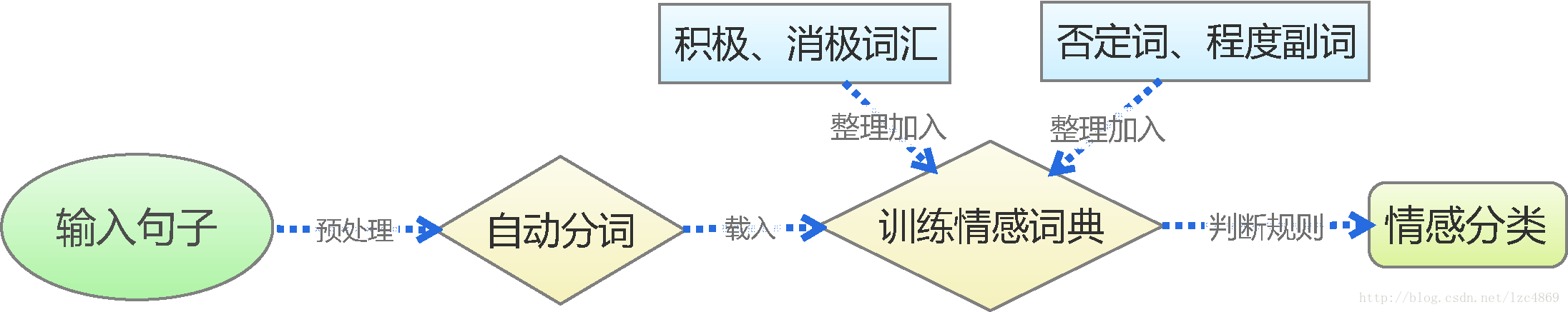 基于上述思路,我们可以通过以下几个步骤实现基于情感词典的文本情感分类:预处理、分词、训练情感词典、判断,整个过程可以如下图所示。