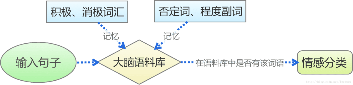 传统的基于情感词典的文本情感分类,是模拟我们人的大脑思维方式而产生的一种方法。我们大脑首先通过学习来记忆一些基本词汇,如否定词语有“不”,积极词语有“喜欢”、“爱”,消极词语有“讨厌”、“恨”等,从而在大脑中形成一个基本的语料库。然后,我们再对输入进大脑的句子进行最直接的拆分,看看我们所记忆的词汇表中是否存在相应的词语,然后根据这个词语的类别来判断情感,比如“我喜欢数学”,“喜欢”这个词在我们所记忆的积极词汇表中,所以我们判断它具有积极的情感。