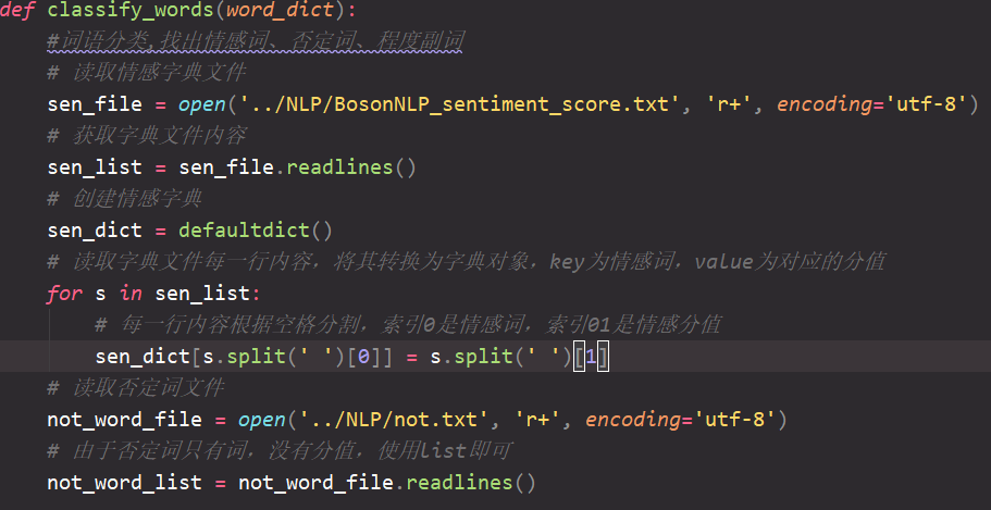 # 读取字典文件每一行内容,将其转换为字典对象,key为情感词,value为对应的分值