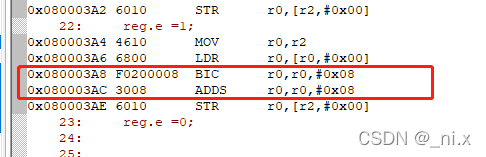 | 再设置R1的bit4为1 | ADDS r1,r1,#0x08 |