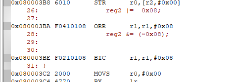 | reg2 |= 0x08; | ORR r1,r1,#8 |