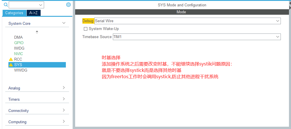 使用了RTOS,默认使用SysTick;所以HAL库的时基就要用其他的定时器。 当用了RTOS,就要设置HAL的timebase为其他Timer,因为Systick会被操作系统设置为最低优先级中断,以及HAL使用了weak定义timebase的ISR中断函数,大家用同一个,会被RTOS的版本重载。 HAL时基不要选的和 RTOS的一样,RTOS默认是使用SysTick的中断来调度任务的,但是 HAL库也需要一个周期性的中断,它就建议你这两个周期性的中断不要用一个定时器。 另外HAL库本身一些函数的操作是需要始终节拍的,所以把这两个时钟节拍独立开来。 |