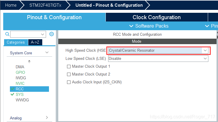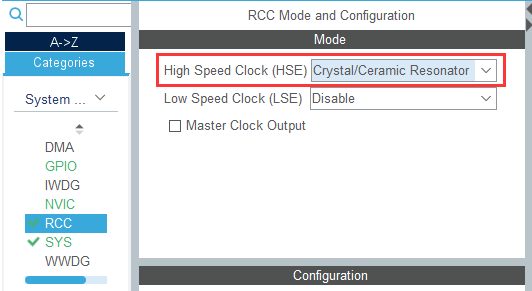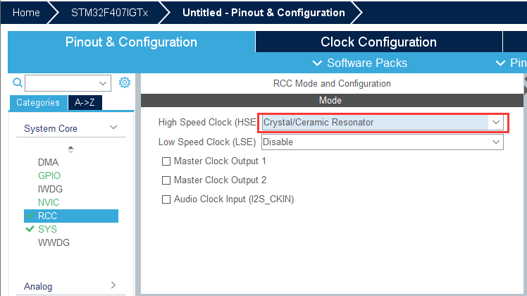 Crystal/Ceramic Resonator表示晶体/陶瓷晶振,谐振器即相当于石英/陶瓷 晶振,OSC_IN 与 OSC_OUT引脚都要连接,对应选择为Crystal/Ceramic Resonator。