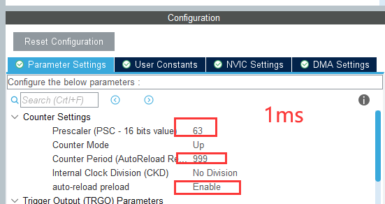 所以定时器频率为 f = 72M / Prescaler / Period = 72000 000 / 72 /1000 = 1000Hz;