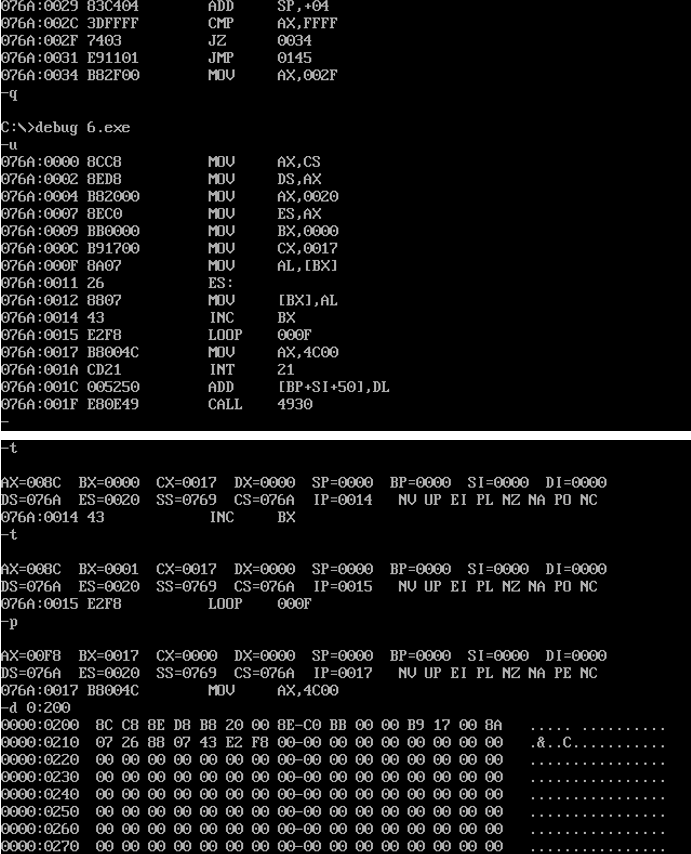 mov cx,17h//前面的源程序在内存中总共占了23字节,这个是将源程序编译连接之后用debug里面的U命令查看即可