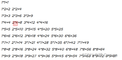 第二次循环,i = 2,i <9,进入循环体,到第二个for循环里,j = 1 , j < i , 然后进入循环体,打印 1 * 2 = 2,j + 1,然后j = 2,i =2,