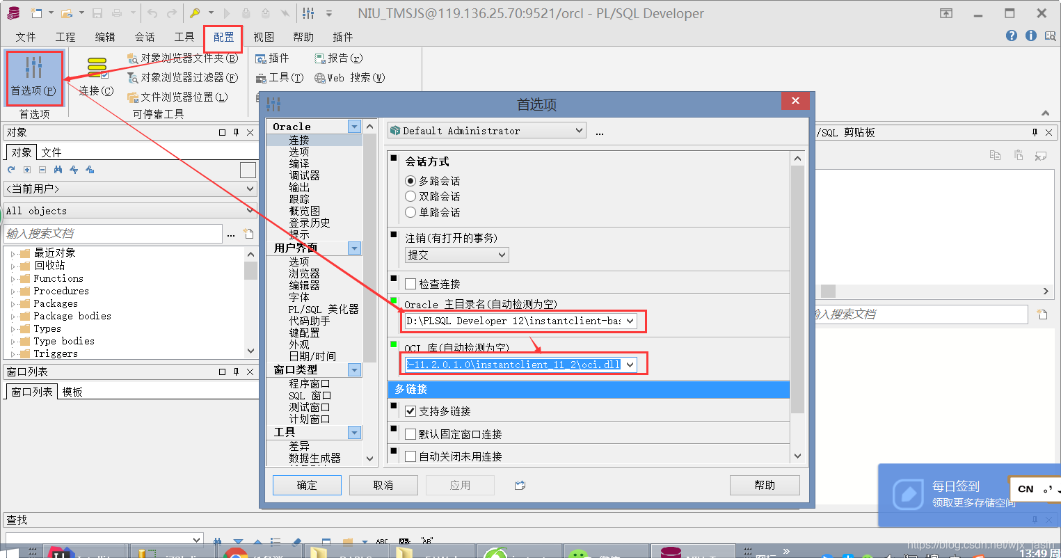 2.PLSQLDeveloper安装后,先不登录,直接进入页面,配置Oracle Home(Oracle 主目录)和OCI library(OCI库),配置如下: