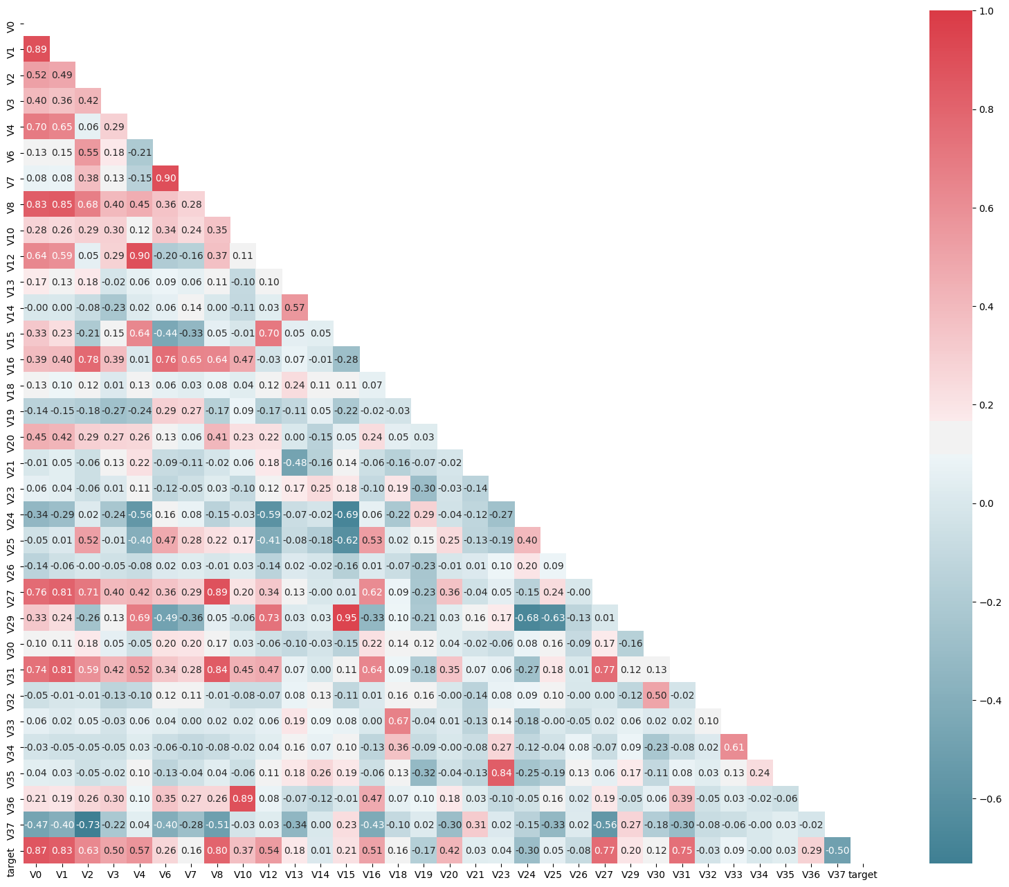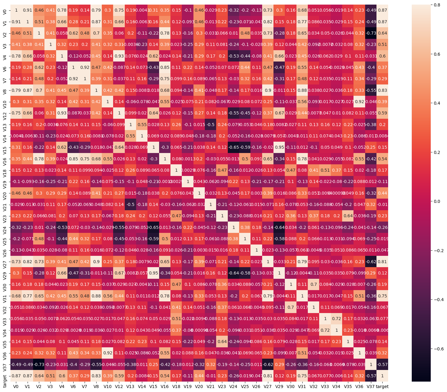 此训练集数据共有2888个样本,数据中有V0-V37共计38个特征变量,变量类型都为数值类型,所有数据特征没有缺失值数据;