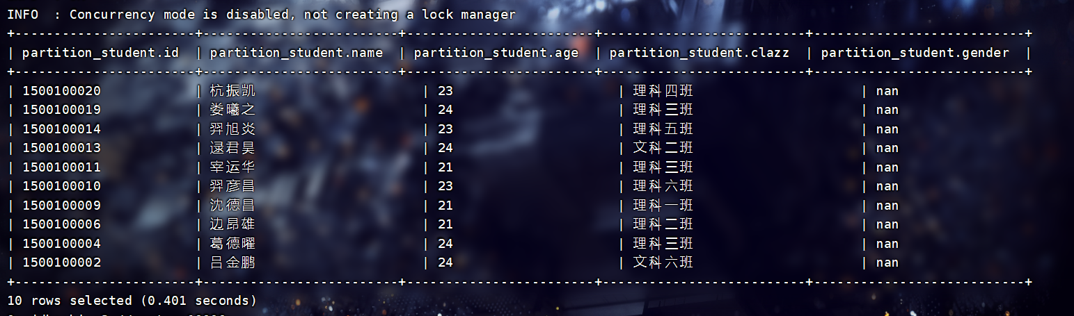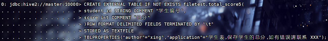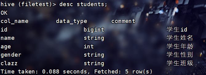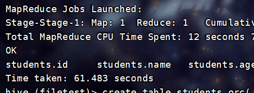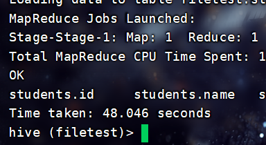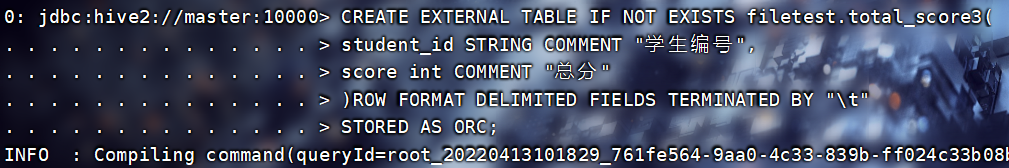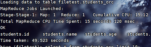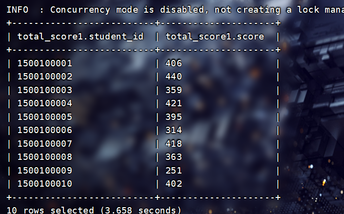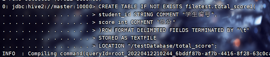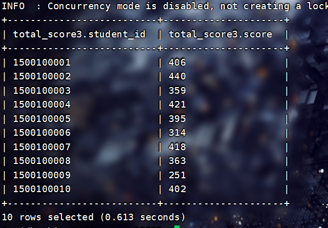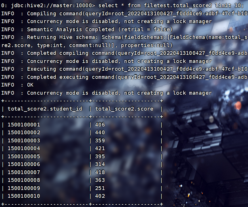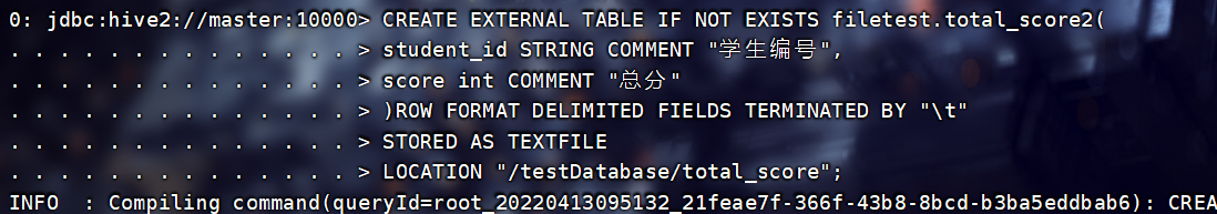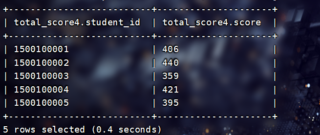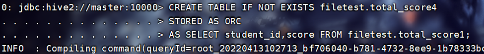 INSERT INTO TABLE filetest.total_score3 SELECT * FROM filetest.total_score1;查看:
