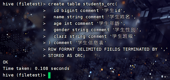创建一个存储格式为ORC的表: