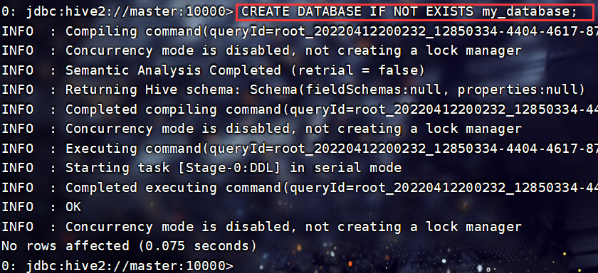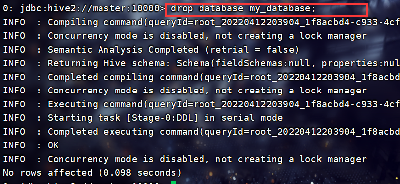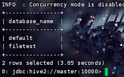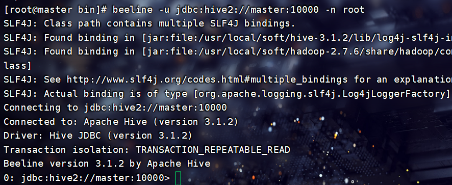 beeline -u jdbc:hive2://master:10000 -n root连接JDBC: