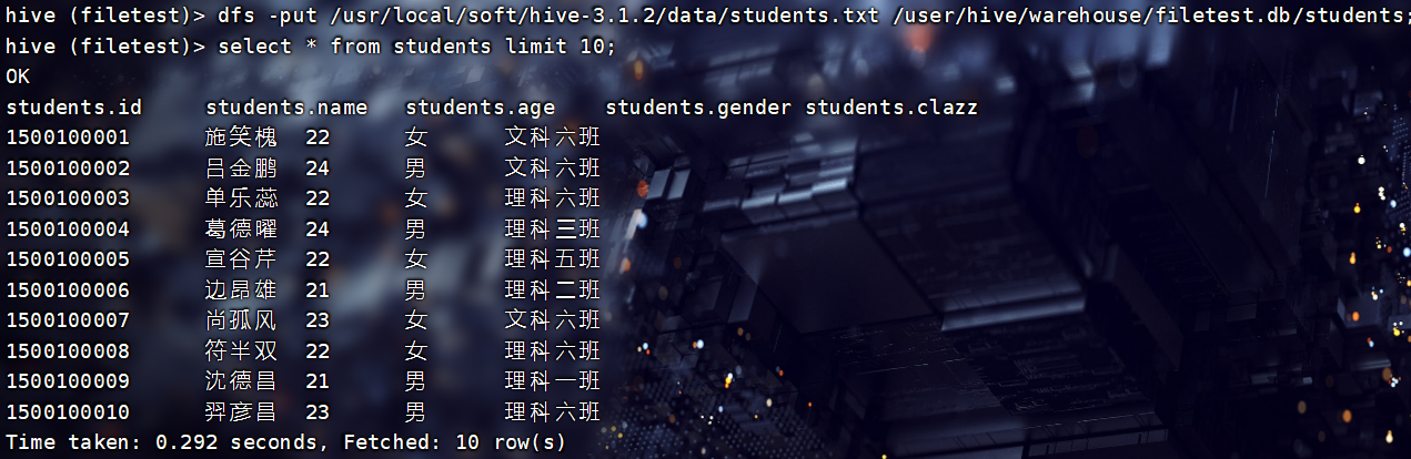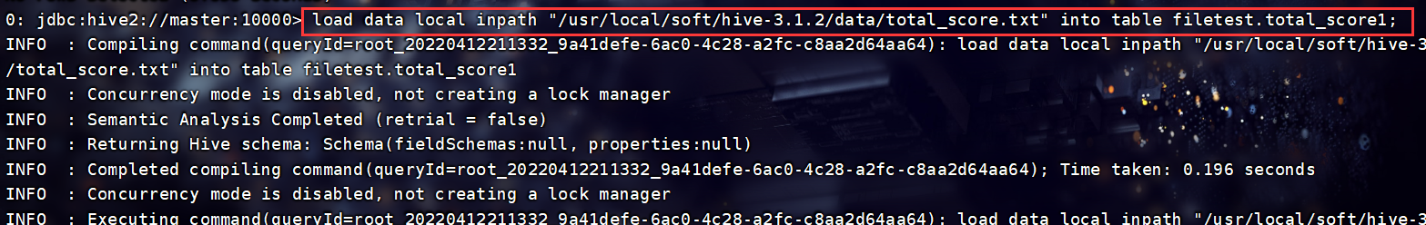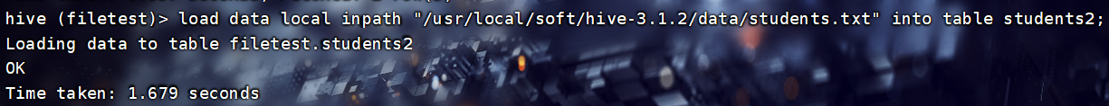load data local inpath "/usr/local/soft/hive-3.1.2/data/total_score.txt" into table filetest.total_score1;