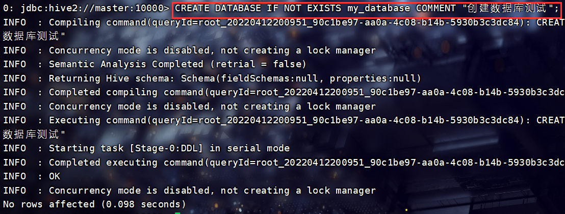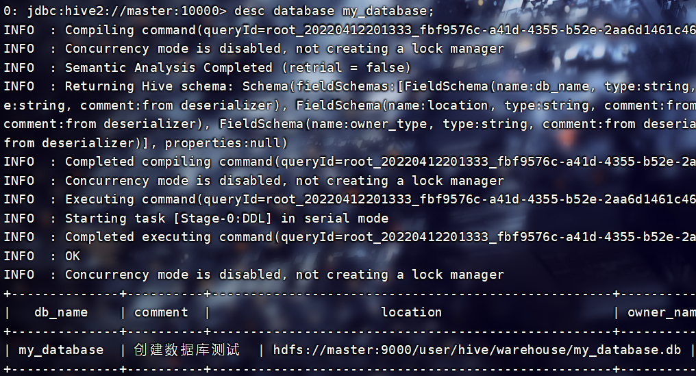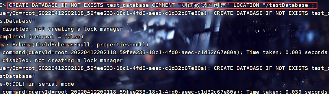 CREATE DATABASE IF NOT EXISTS test_database2 COMMENT "测试数据库创建" WITH DBPROPERTIES("author"="作者","application"="库中所包含信息");