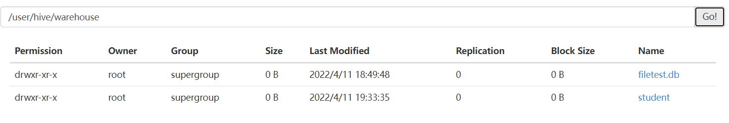 通过查看信息可以发现该数据库的默认存放位置在hdfs上的warehouse目录下