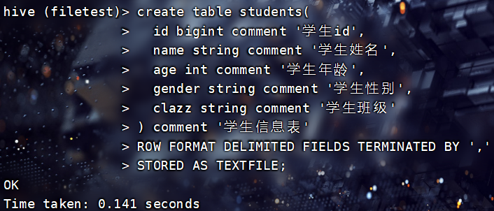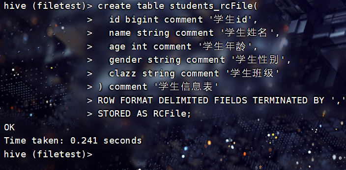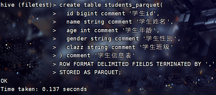 注意:以上创建表格式中指定存储格式为文本格式,若存储格式变为压缩格式ORC等,那么就不能直接将文本数据加载到表中