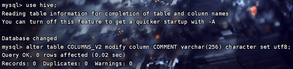 alter table COLUMNS_V2 modify column COMMENT varchar(256) character set utf8