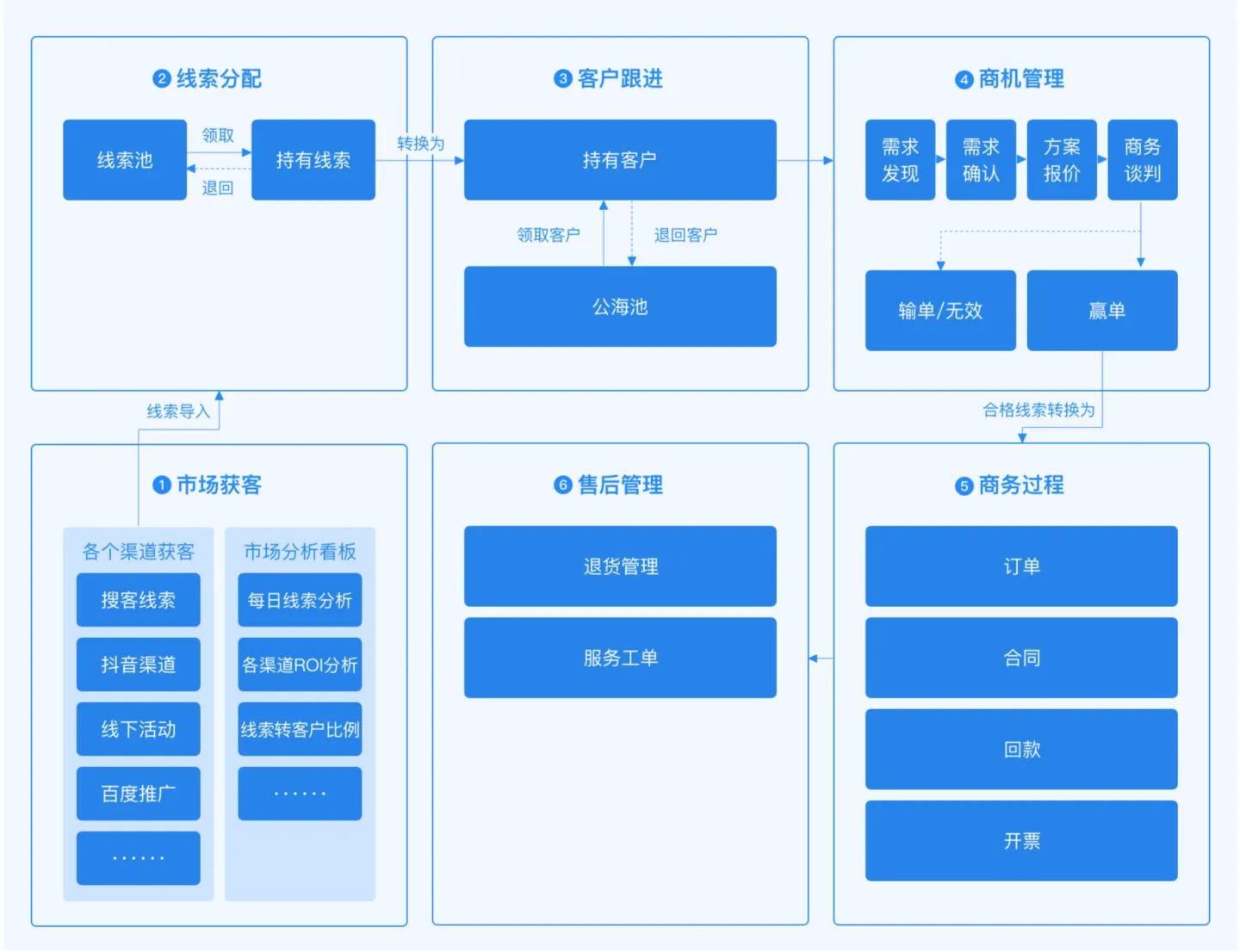 我们如果把CRM整个业务串成一条线的流程,那么这张图大概率会长下面这样: