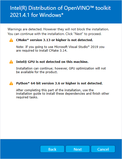 本文以Window 10 、Visual Studio with C++2019、CMake3.19、Python3.6、OpenVINO 2021.4.2版本为例;