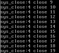 由于打印显示范围所限,不能显示所有调试信息。但是可以看出,4号进程关闭了直到19号的文件描述符,也就是关闭了一个进程所能打开的所有文件描述符。因此日志文件被关闭,后续4号进程创建的3号文件描述符已不再指向日志文件