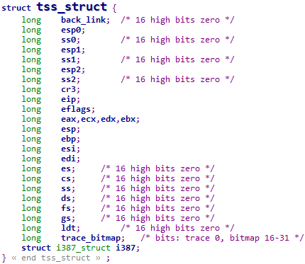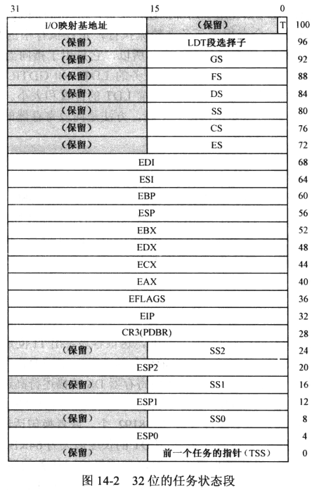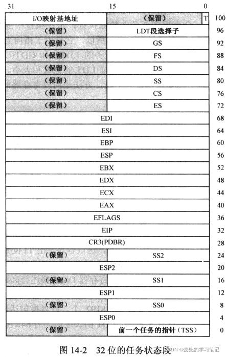 ② IA-32体系结构中定义的TSS段结构如下,可见tss_struct结构各字段与TSS段结构一致