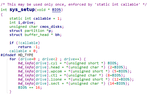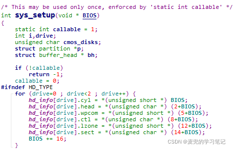 ② 进入内核态后调用的是sys_setup函数,该函数读取硬盘参数(包括分区表信息)并加载虚拟盘(如果存在的话)并安装根文件系统