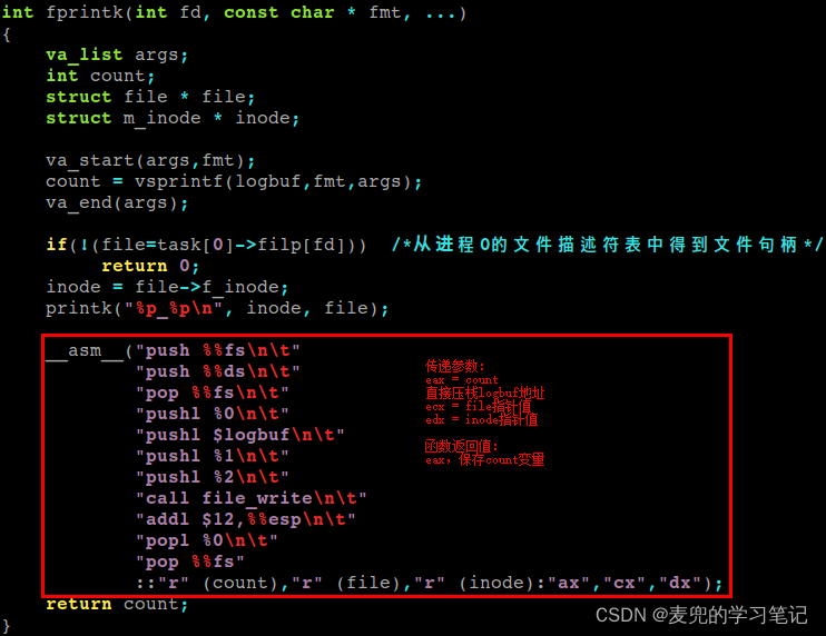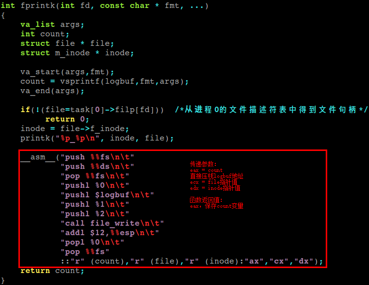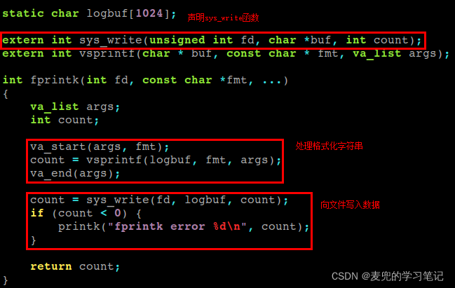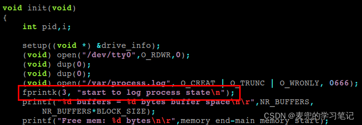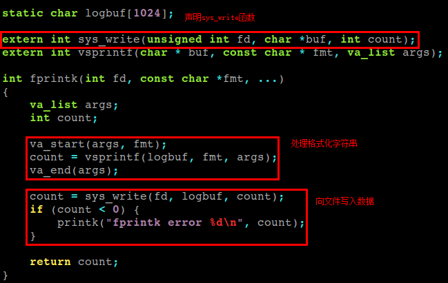 3. 内核用于记录log的fprintk函数需要结合printk和sys_write函数实现,其中从printk函数借鉴处理格式化字符串的方法,然后利用sys_write函数实现将数据写入文件