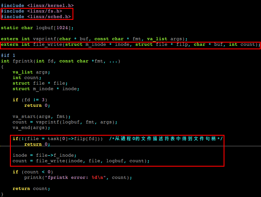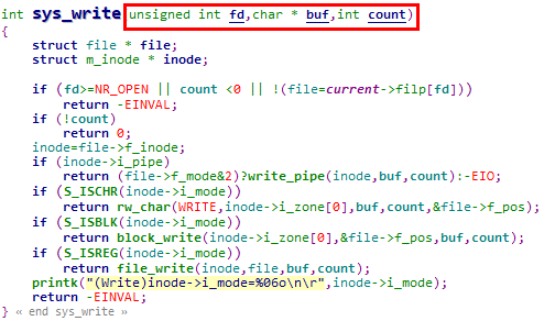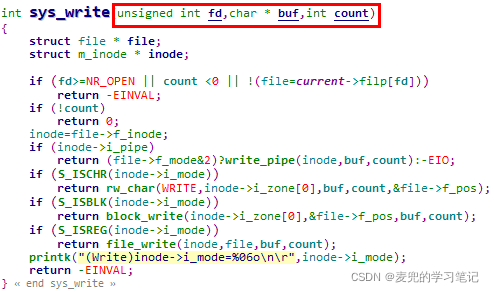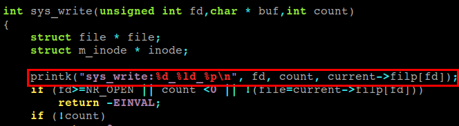 我们分析一下sys_write函数,可见在fprintk调用sys_write时存在文件描述符不存在的情况