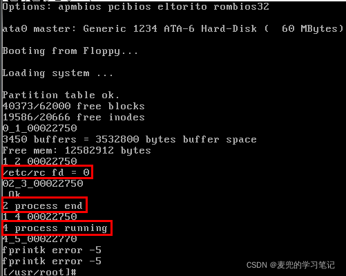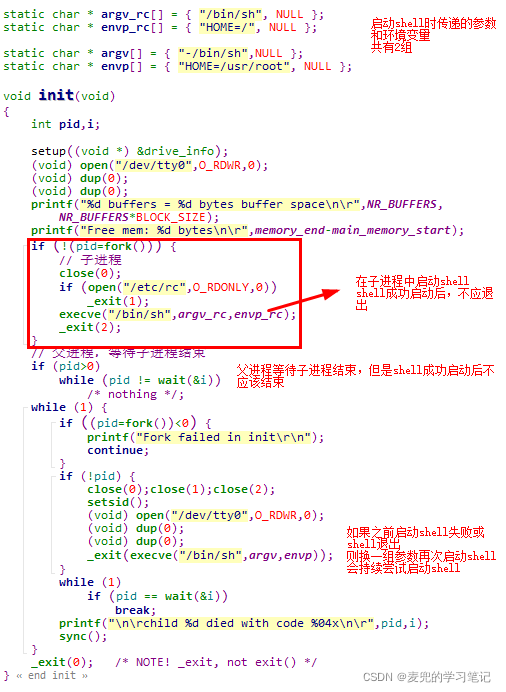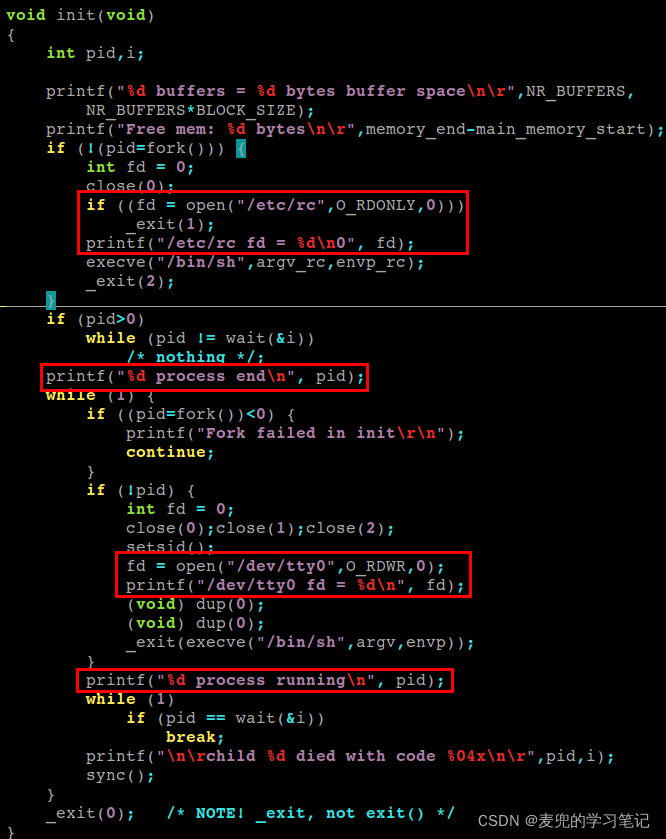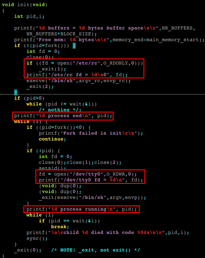 从上节验证结果分析,2号进程(之前分析为启动shell)会启动3号进程,但是4号进程却是1号进程(init进程)启动的,所以猜测2号进程已经退出。下面在init函数中增加打印信息进行验证