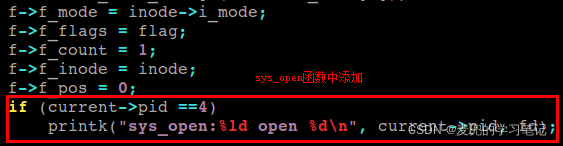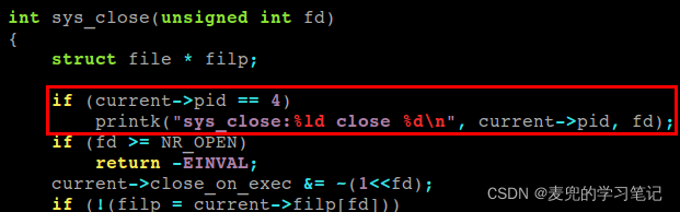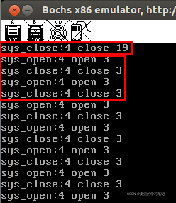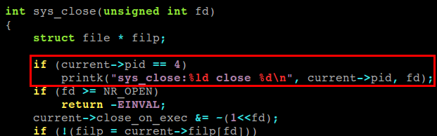 我们在sys_close函数和sys_open函数中增加打印信息,进行验证。这里之所以限制打印的PID,是因为打印信息过多会导致虚拟机工作异常