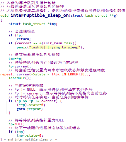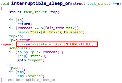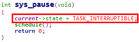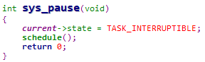 ③ pasue系统调用进入内核态后,会调用sys_pause函数,该函数将当前进程设置为TASK_INTERRUPTIBLE状态,之后调用schedule函数发起进程切换