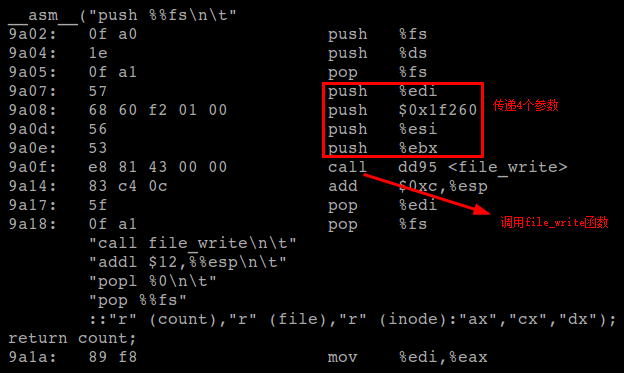 参考网上的实验代码,使用内嵌汇编的方式调用file_write函数(与修改方案1只有这处区别)