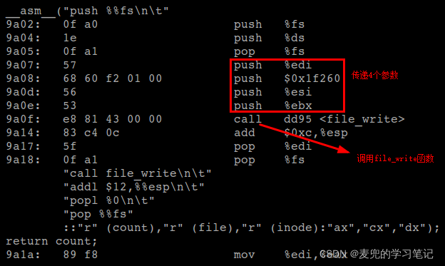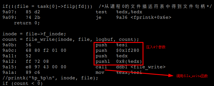 可见二者的核心差异,就是可运行的版本在调用file_write函数之前,将fs寄存器的值压栈,并将ds寄存器的值赋给fs。这步操作是非常关键的,因为logbuf数组在内核态定义,由ds寄存器指向;而file_write函数中通过fs寄存器获取要写入的数据,此时fs寄存器正指向用户态段选择子,因此无法正确打印