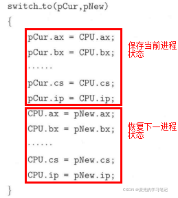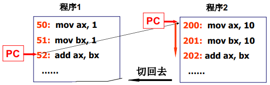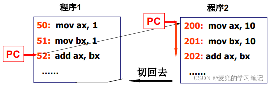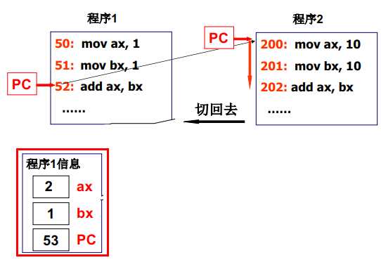 2. 以上图为例,如果只是修改PC指针,那么程序2中也会使用ax和bx寄存器,从而破坏了程序1切换时的状态。当CPU从程序2切换回程序1时,将无法正确执行