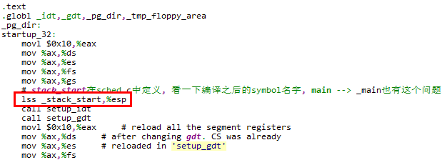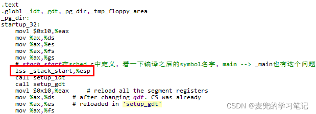③ 那么当前[SS : ESP]指向栈在哪里呢?是在system模块的head.s中被设置为如下值,