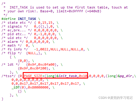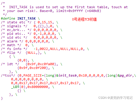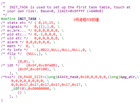 0号进程的内核栈[SS0 : ESP0]需要设置在TSS段,INIT_TASK中的值如下,