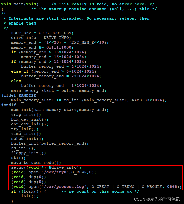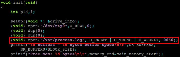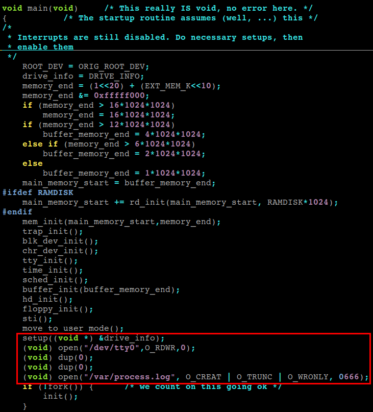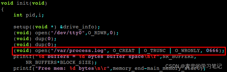 2. 打开日志文件只能在文件系统挂载之后,而挂载文件系统是在1号进程执行的init函数中(调用setup函数)。而且init函数也是在调用setup函数之后打开标准输入 / 标准输出 / 标准错误三个文件