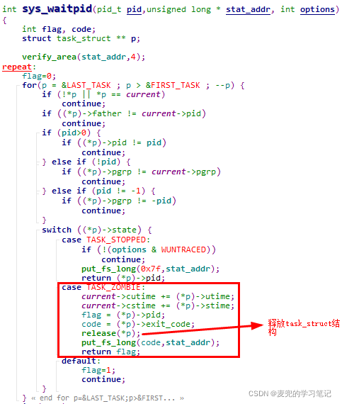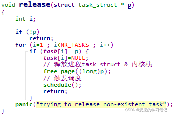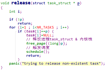 release函数主要被sys_waitpid函数调用,在父进程回收子进程状态并释放子进程资源后触发调度
