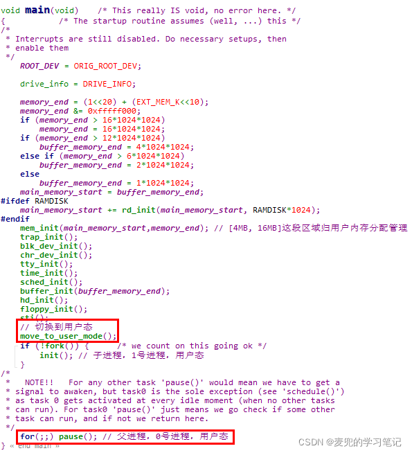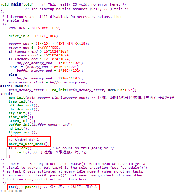 2. 在调用move_to_user_mode函数后,main函数的执行进入用户态(CPL = 3),并且在父进程中循环调用pause函数