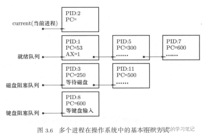 2. 以上图为例,操作系统中共有3个进程,对应3个PCB结构,其中,
