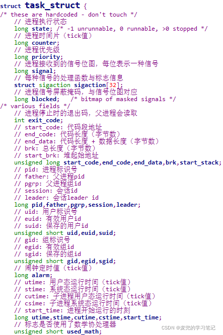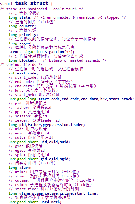 在Linux 0.11中,实现PCB功能的是task_struct结构(定义在include/linux/sched.h),其中保存着用于控制和管理进程的所有信息,其中各字段含义如下,