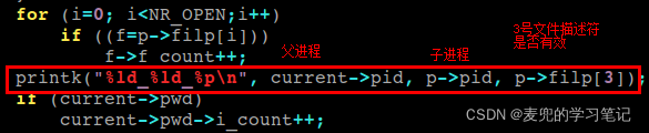 猜测是在这些进程中存在关闭文件的操作,导致3号文件描述符被关闭,之后新建的3号文件描述符并不指向日志文件。我们首先在copy_process函数中增加打印信息,验证新创建进程的文件描述符3指向;同时打印新创建进程的父进程PID