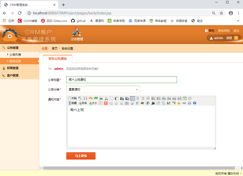 具有公告权限的用户可以负责公告的发布,公告发布后所有的用户都需要查看。
