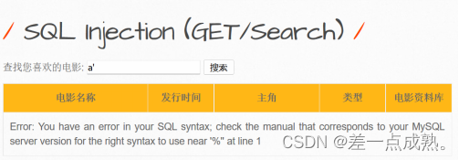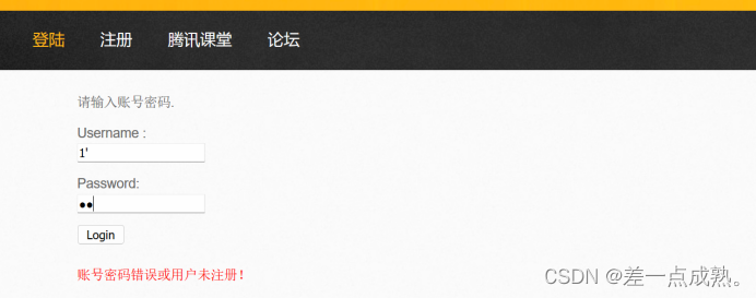 进入靶场后出现此界面,在登录界面输入1’判断一下是数字型还是字符型。