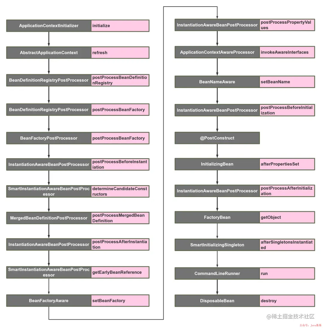 我们从这些spring&springboot的扩展点当中,大致可以窥视到整个bean的生命周期。在业务开发或者写中间件业务的时候,可以合理利用spring提供给我们的扩展点,在spring启动的各个阶段内做一些事情。以达到自定义初始化的目的。此篇总结,如果有错误或者疏漏的地方,恳请指正。