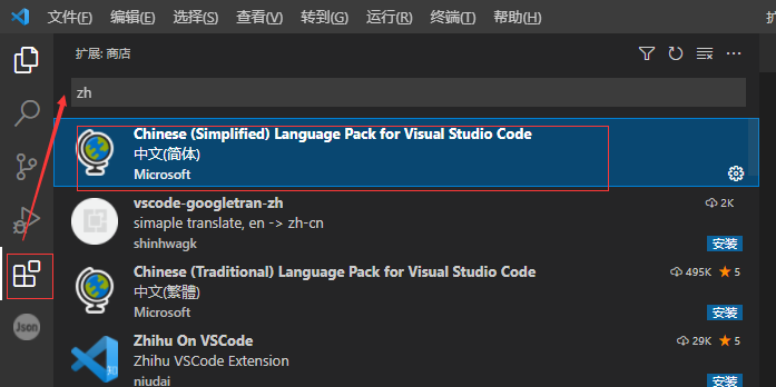 3.6 汉化:扩展按钮——>搜索zh,找到中文汉化包安装