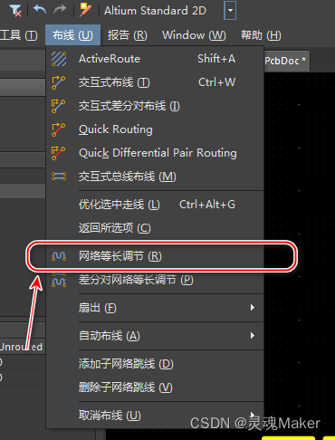 4.我们选择最短的线进行蛇形走线,让它们等长,,菜单栏里,选 布线(U)-网络等长调节(R)(快捷键U+R)