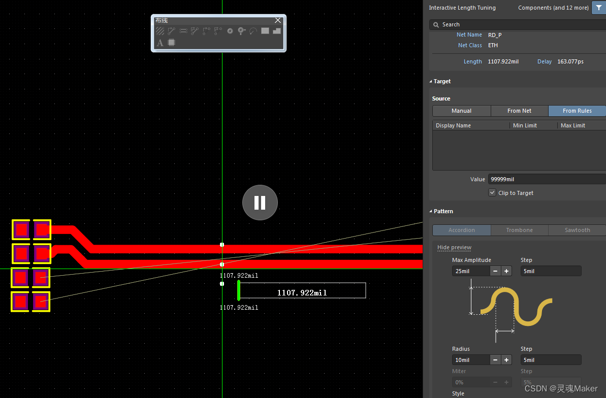 出现十字光标后单击,最短的那根线,,按下TAB键,编辑等长走线相关设置】